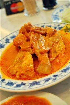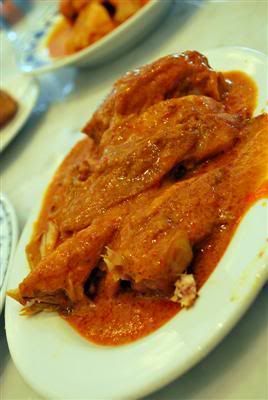 We ordered two types of chicken, curry chicken and chicken begadel (well, I think that's what it's called), a plate of goreng fish, another plate of cabbage, potato cutlets and vegetable salad. When the order came, it also came with a small dish of curry gravy.