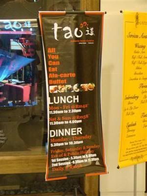 tao claims to be an Authentic Asian Cuisine. Their concept is an ‘All You Can Eat Ala-carte Buffet’. Lunch is RM42++ on weekdays and RM58++ on weekends while dinner on weekdays is RM58++ while on weekends, it's... I'm not sure of the price, please check the prices in the main site. On weekends, there are 2 sessions for dinner – 5.30pm to 8.00pm and 8.30pm to 11.00pm. There is also an early bird special on weekdays. You get 10% off if you have dinner before 7pm, if I recall correctly.